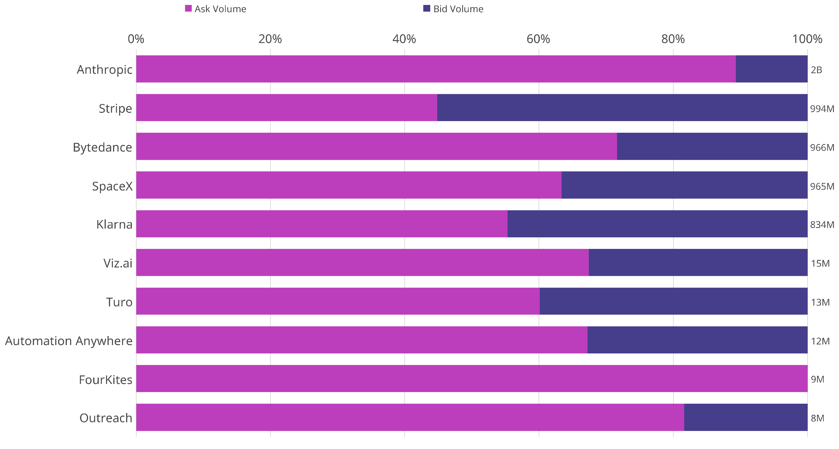 The plot below illustrates the bid and ask volume ratio for the ten companies selected based on the highest and lowest total bid and ask volumes. While Anthropic's total bid and ask volume is the highest, 90% of the volume is attributed to ask orders. Among these ten companies, Stripe has the highest bid volume ratio at 55%. Conversely, FourKites has the highest ask volume ratio at 100%.